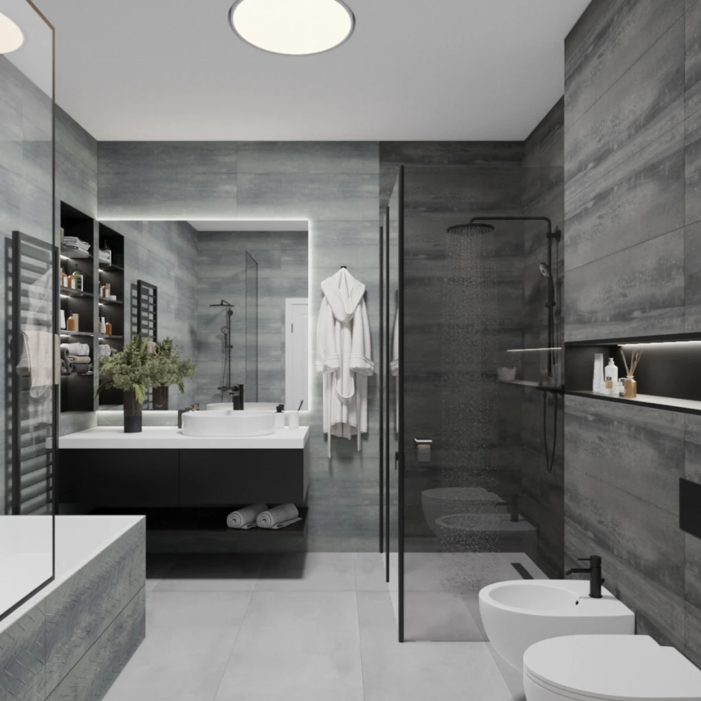 - Багатошарове освітлення: комбінація основного стельового світла та функціонального (біля дзеркала) та декоративного (підсвічування підлоги/тумби) освітлення.