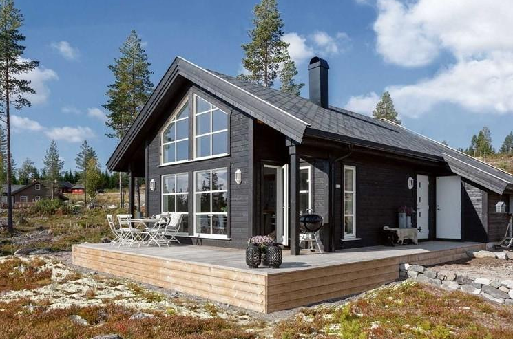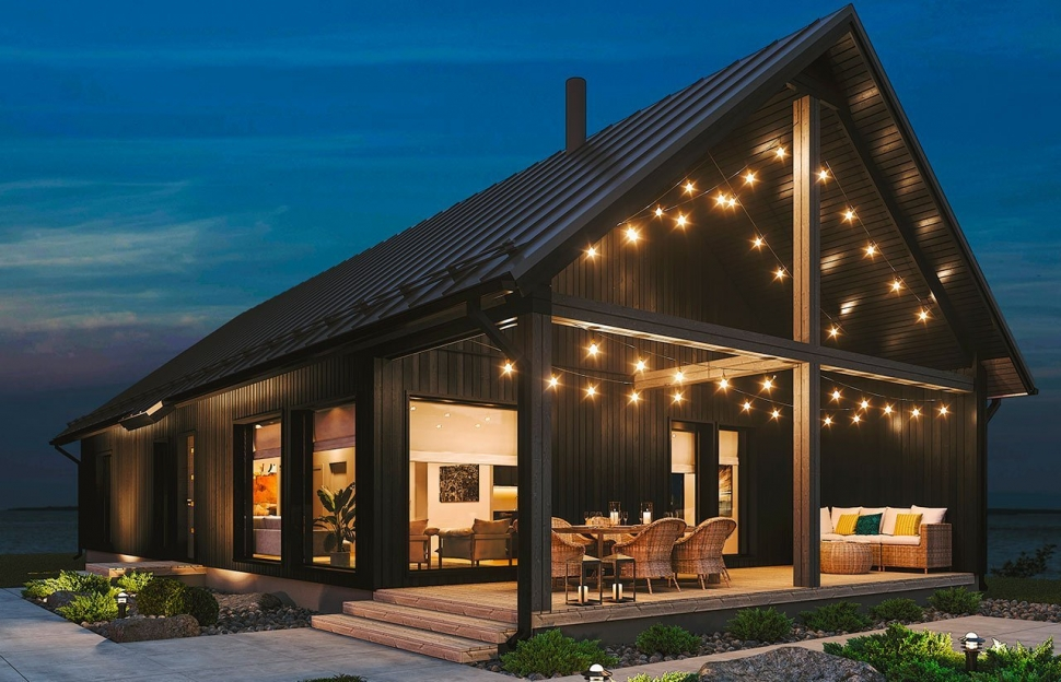 Наприклад, зовнішнє оздоблення часто виконується з вертикальної або горизонтальної дерев’яної дошки, обробленої чорною, сірою або білою фарбою, що не лише захищає матеріал, але й надає будинку строгого, графічного вигляду.
