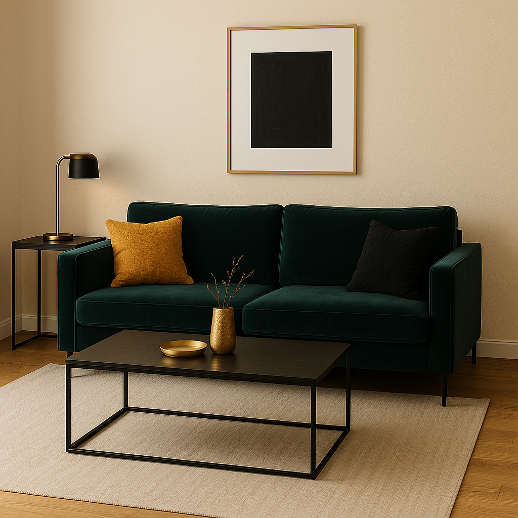 - Меблі: темно-синій або глибокий зелений оксамитовий диван.