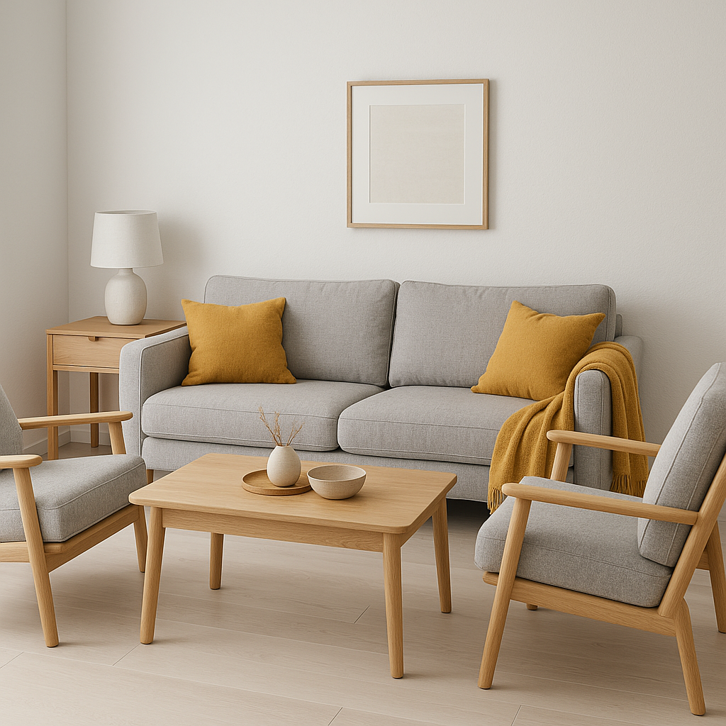 - Акцент (10%): гірчичні подушки та теплий плед.